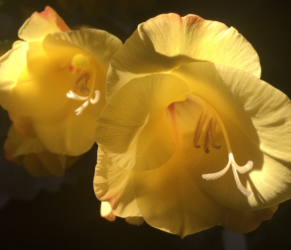 The morning sun on the yellow gladiolas